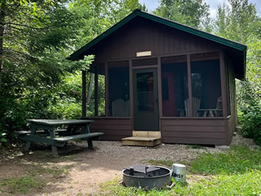 Each includes a refrigerator, microwave, screened-in porch, picnic table outside, and charcoal grill. A shared fire ring is located just outside your door. Bath facilities are a short walk away in a bathhouse building. These cabins are non-smoking and seasonal, available in the summer only.